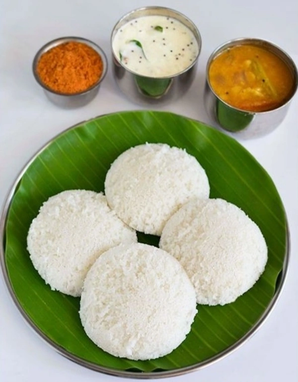 4 Idly Served In Banana Leaf With Sambar & Two Varieties Of Chutney.
